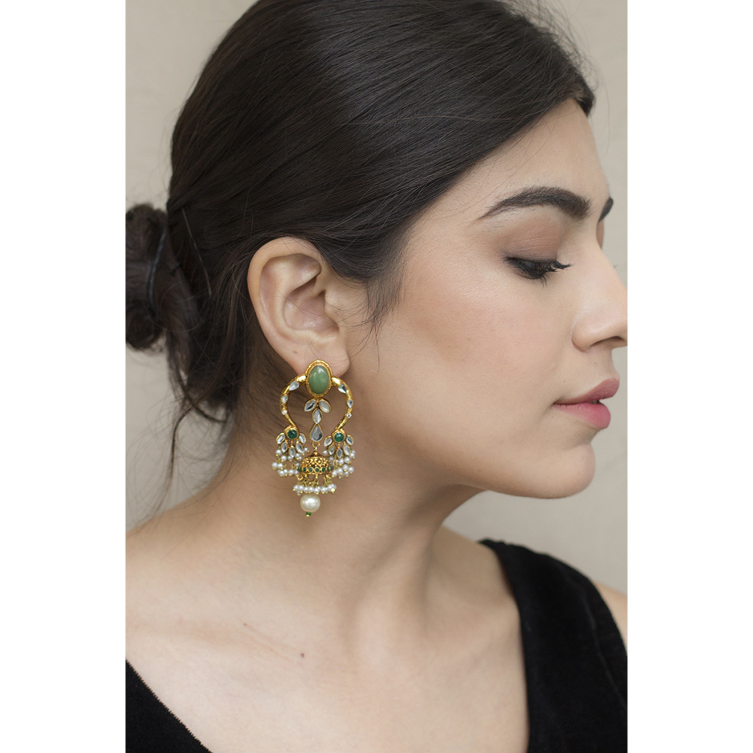 18 k gold plated earrings with green semi transparent natural serpentine stone, kundan and white pearls setting