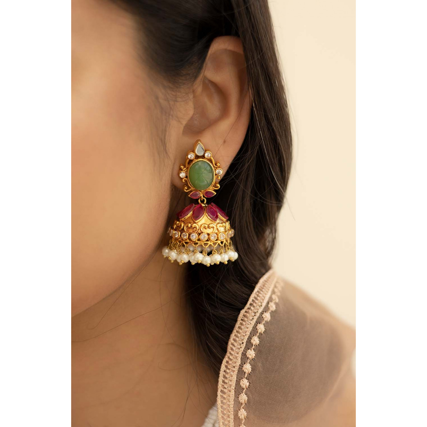 18k gold-plated, Pink and light green stones, and zircons, Kundan with white pearls setting.