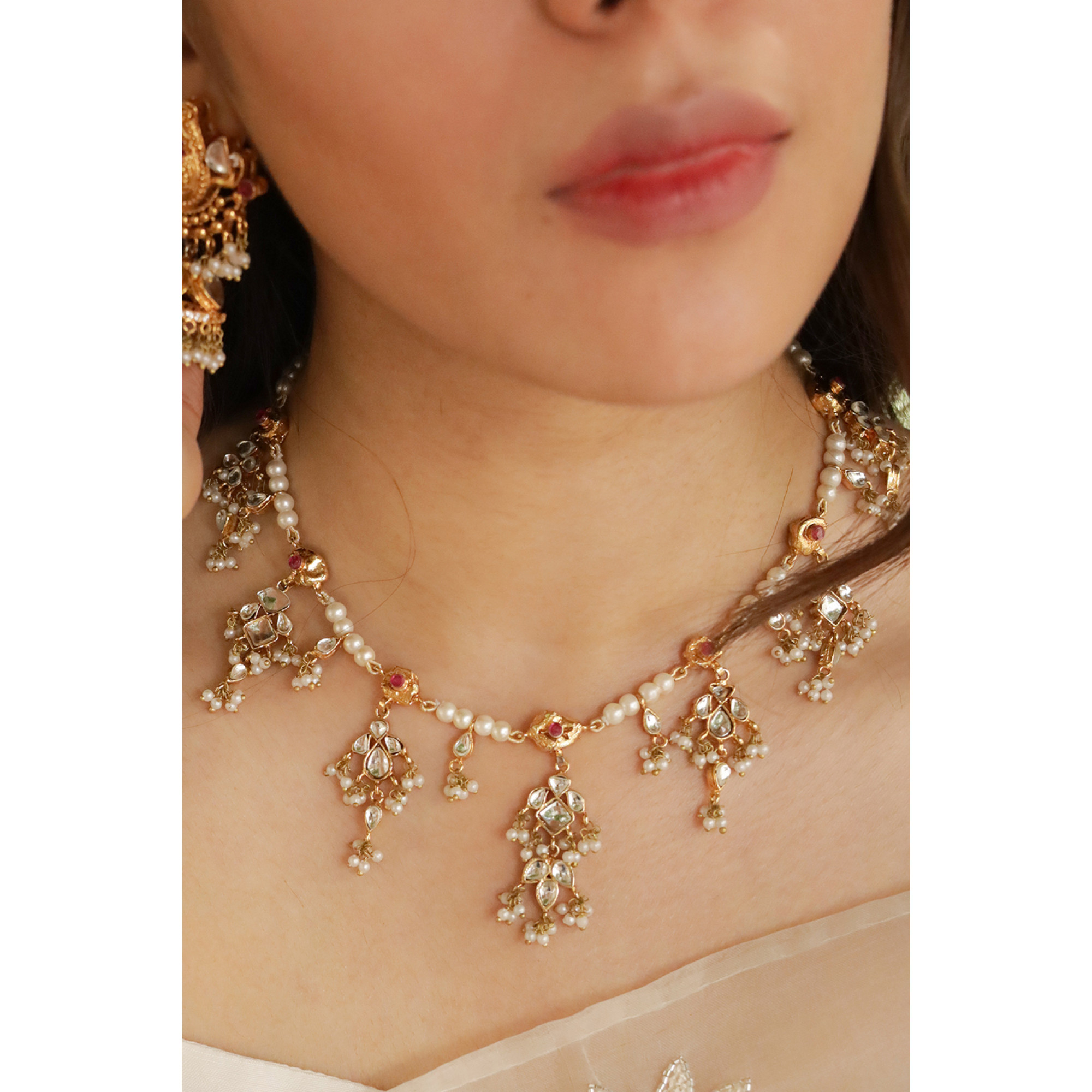 18k gold plated, kundan and pink chetham stone with off white pearls setting.