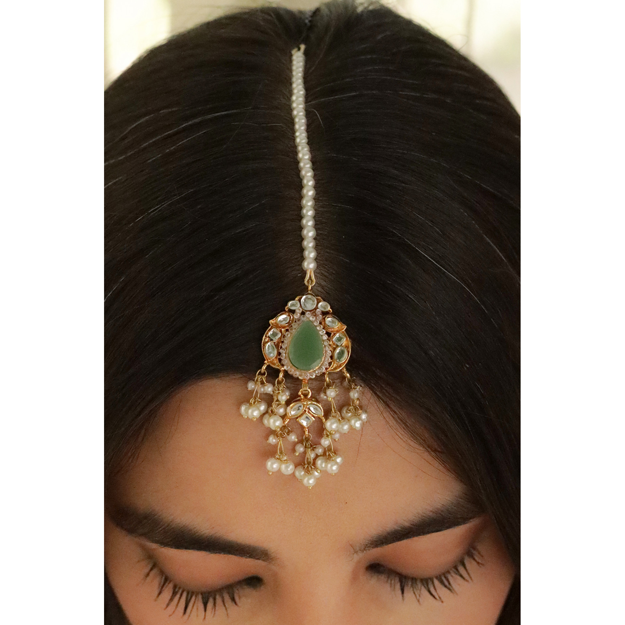 18k gold plated, kundan and light green stone with off white pearls setting.