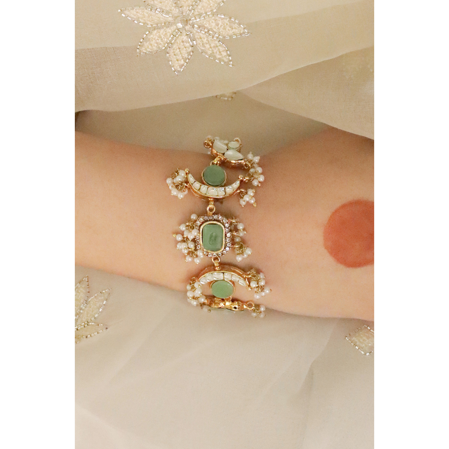 18k gold plated, kundan and light green stone with off white pearls setting.