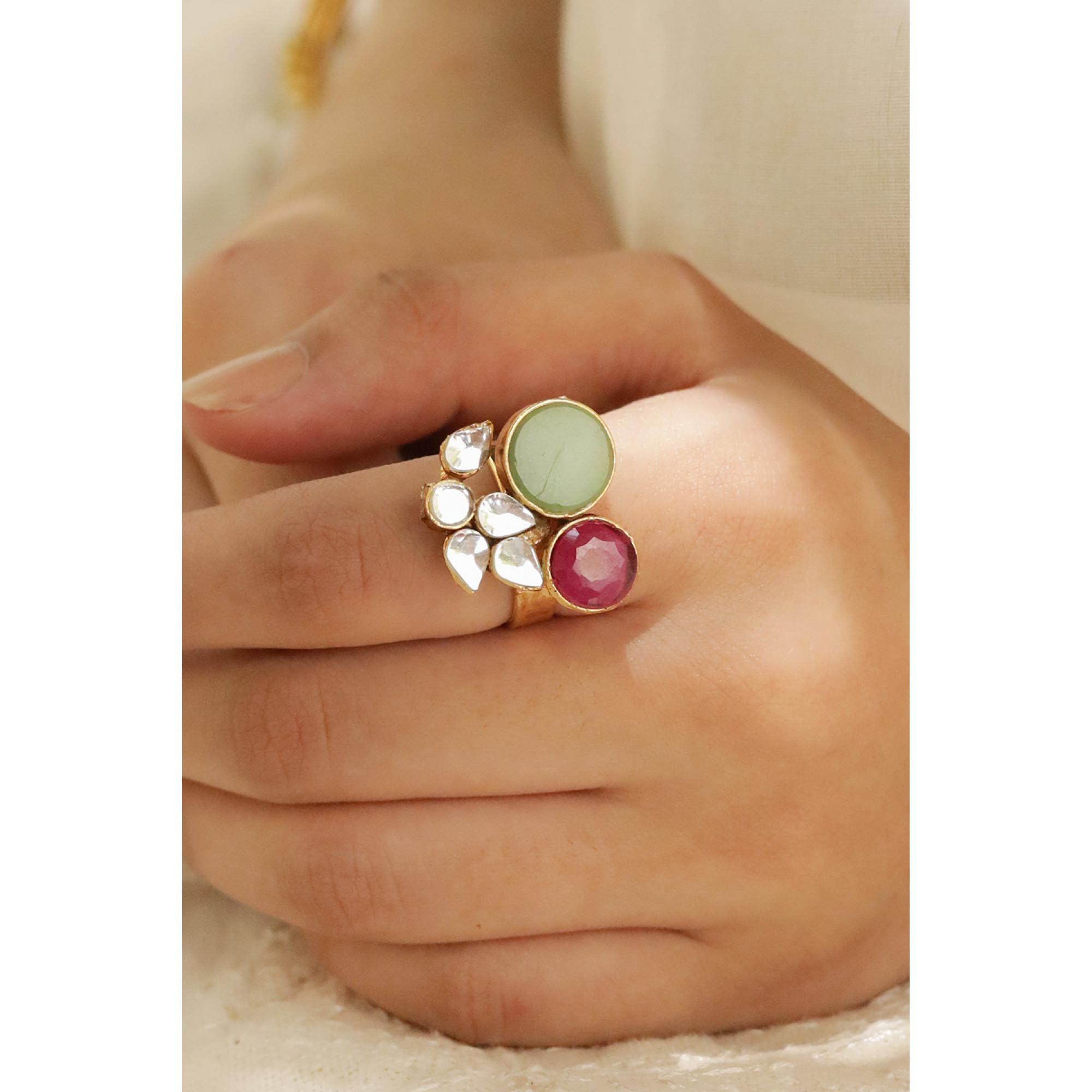 18k gold plated, kundan, light green and pink chetham stone with off white pearls setting.(adjustable ring, no size required).