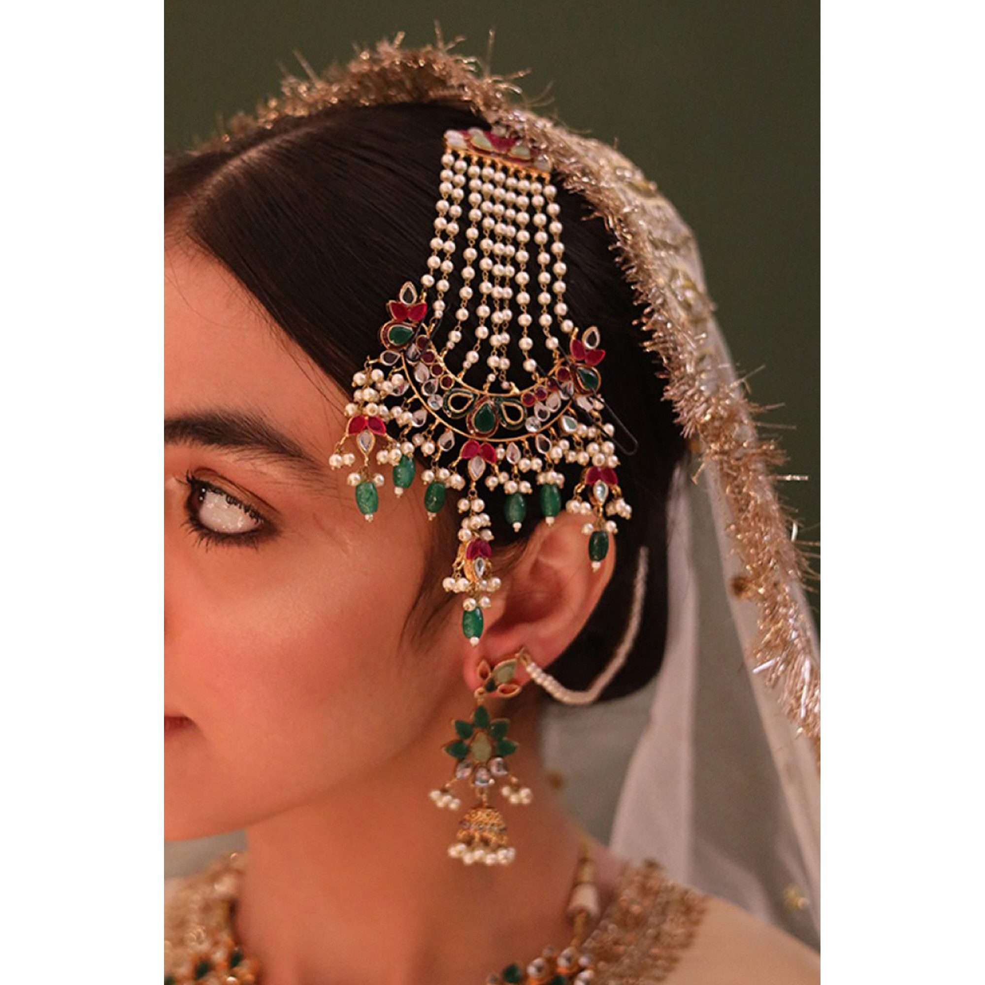 18k gold plated, natural amazonite green and red stones, zircons, meena, kundan and white pearls setting .