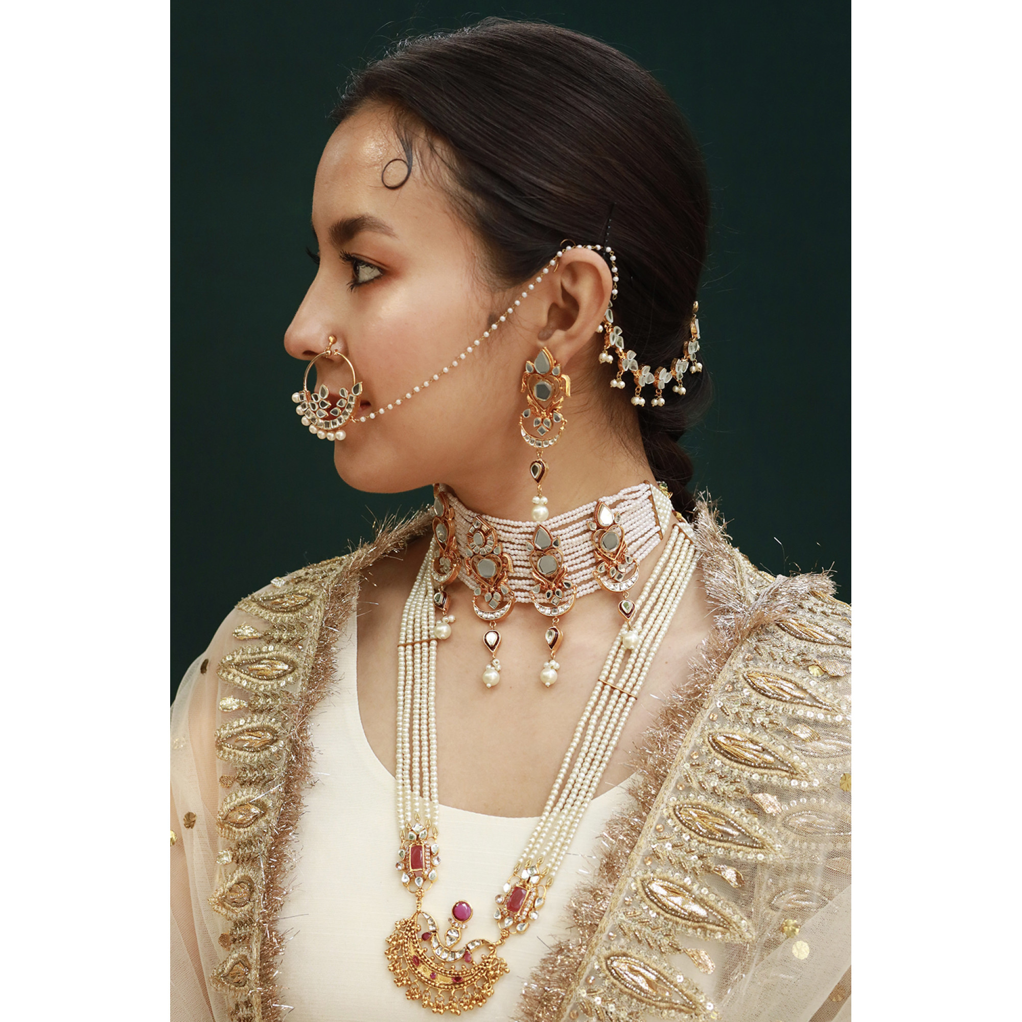 18k gold plated, kundan, granwals, red stone, zircons with white pearls setting.