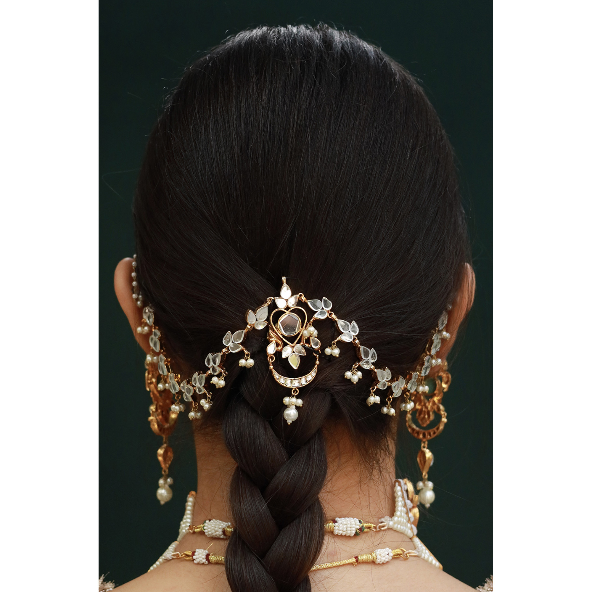18k gold plated jhoomar light green, mint green stone, zircons and kundan with white pearls setting.