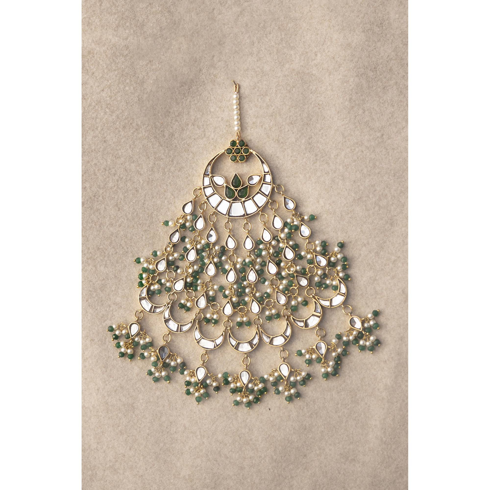 18k gold plated jhummer dark green stones, and kundan with white and green pearls setting.