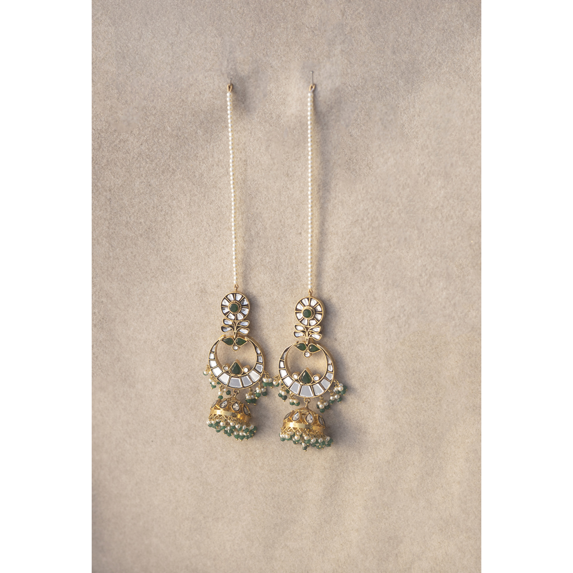 18 k gold plated earrings with kundan, dark green stone and white pearls setting.