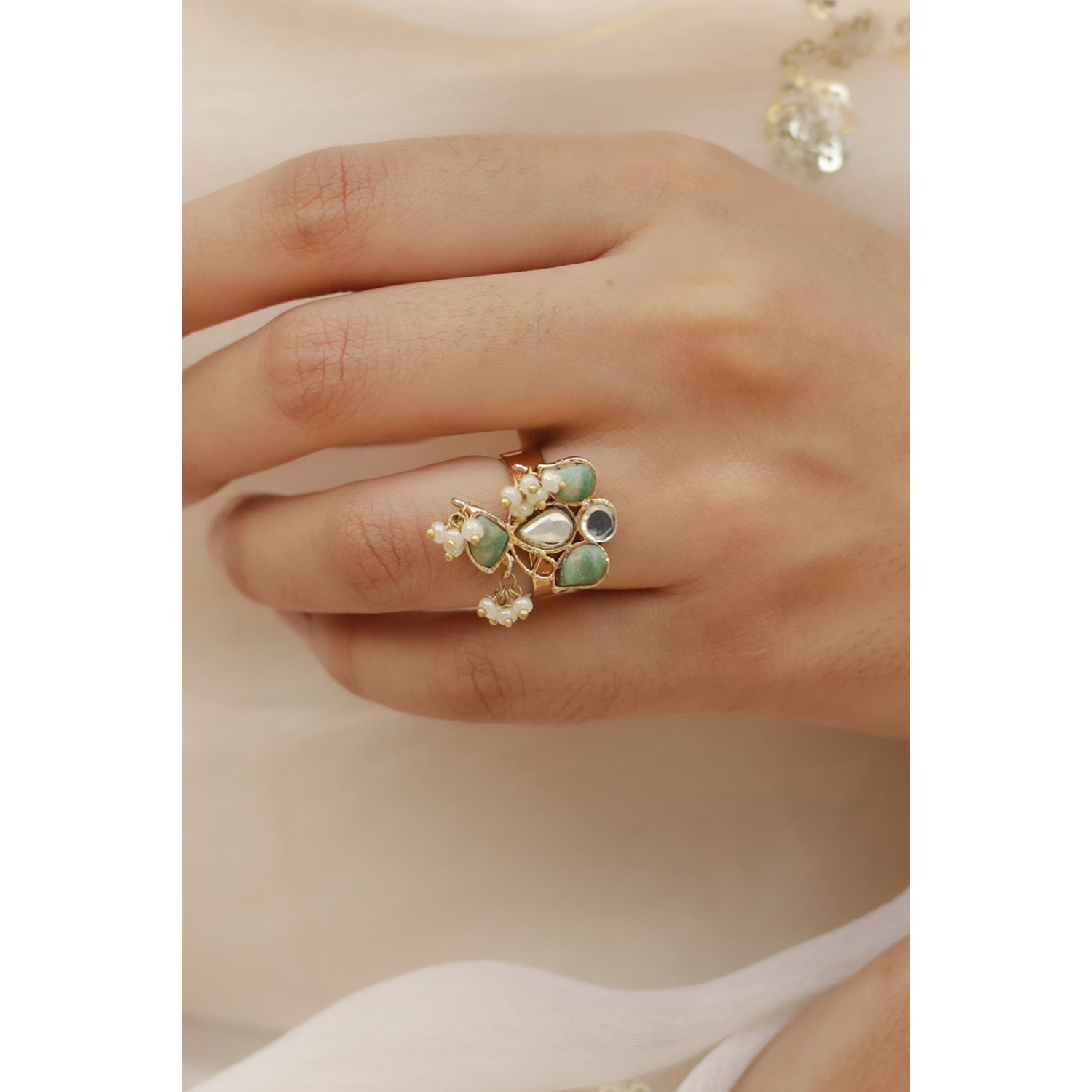 18k gold plated, kundan, adventure natural stone with white off pearls setting.(adjustable ring, no size required).