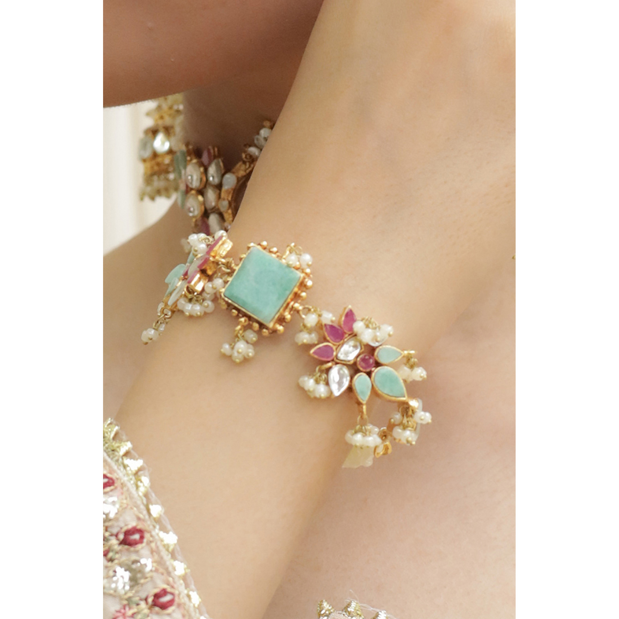 18k gold plated, kundan, adventure natural stone with off white pearls setting.adjustable braclete, no size required).
