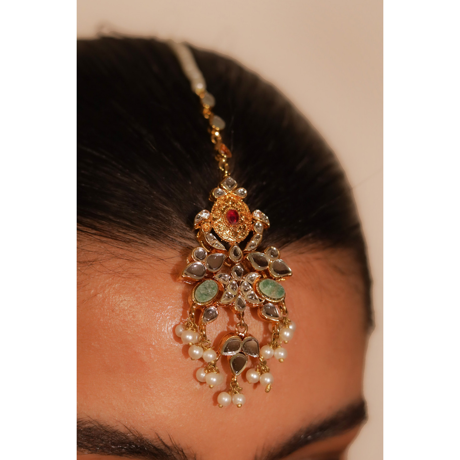 18k gold plated, kundan, natural amazonite stone, pink stone, zircons, and white pearls setting.