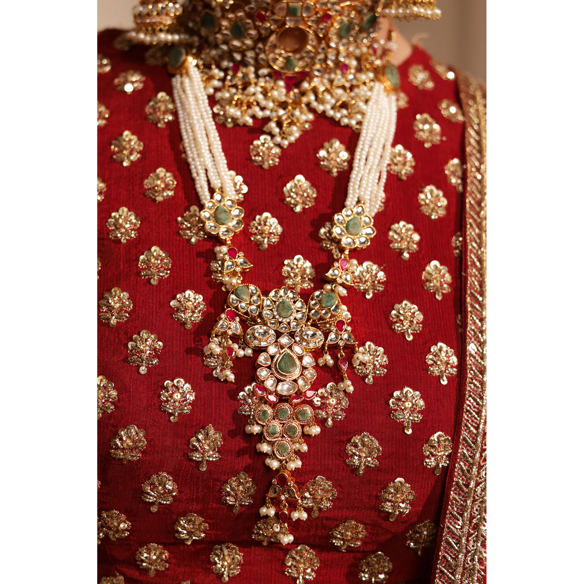 18k gold plated, kundan, natural amozanite stone, pink stone, pulki kundan, zircons, and white pearls setting.