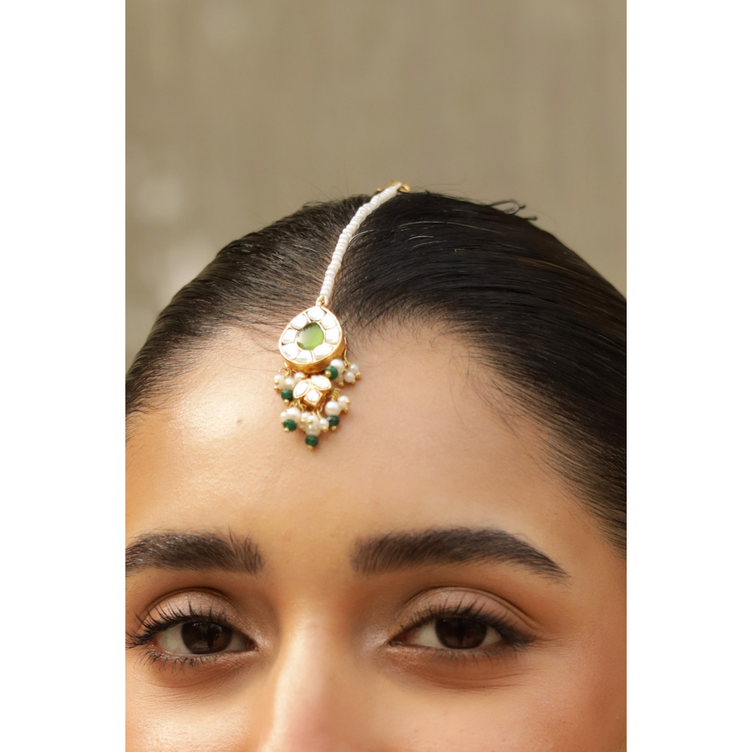 18k gold plated, Kundan, green meena and white pearls setting.
