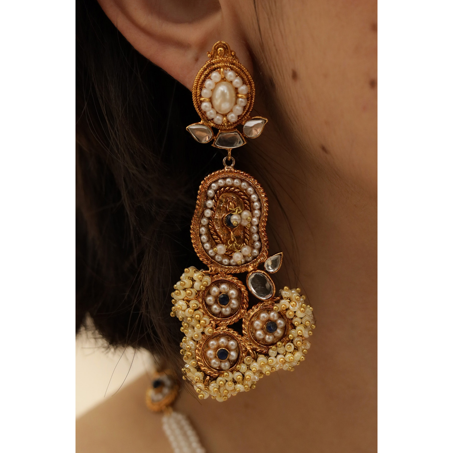 18k gold plated, Kundan, and pearl blue stone with white pearls setting.